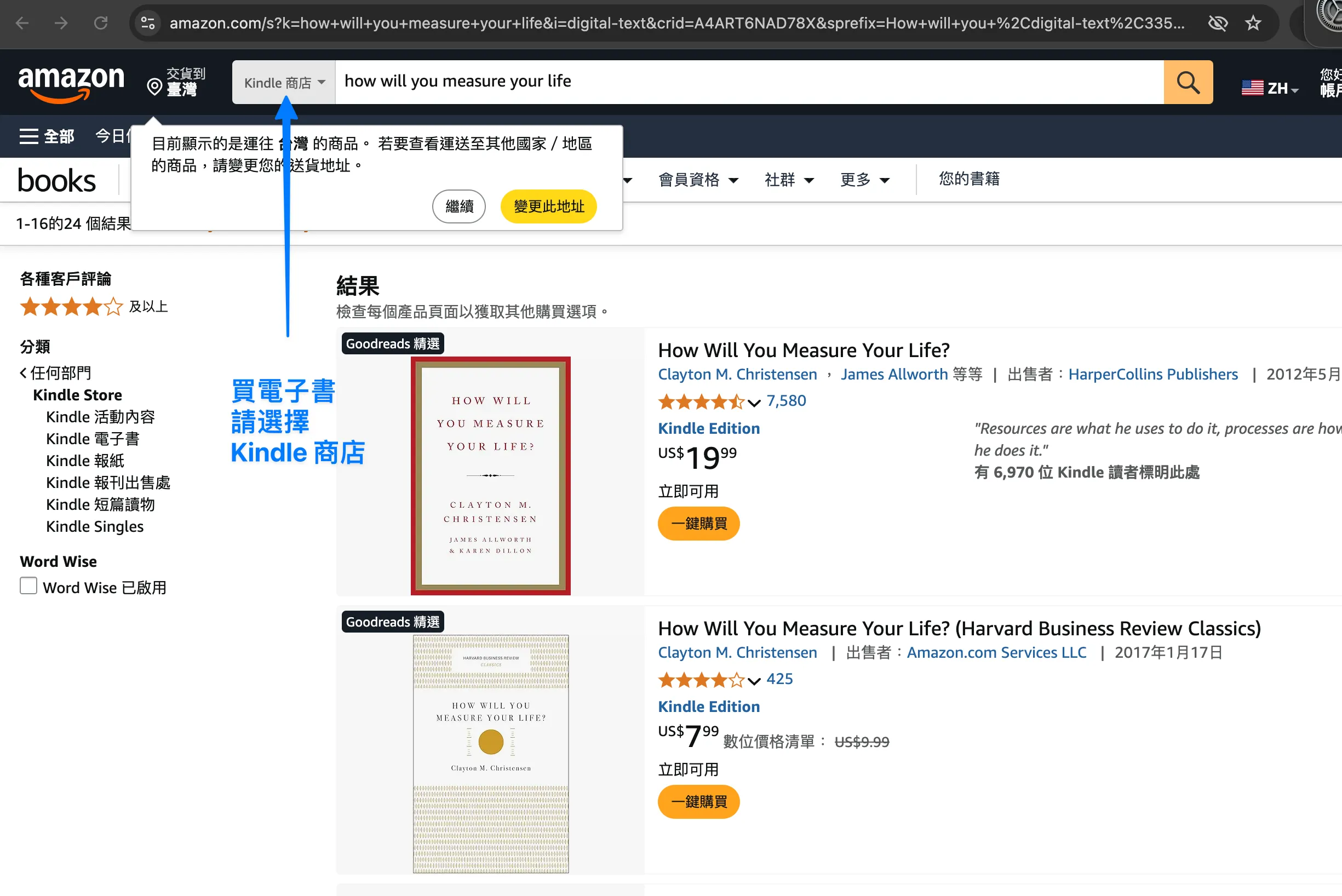 在搜尋的欄位,我會選擇 Kindle 商店 因為我要買的是電子書。看到下方的搜尋結果,大家也許會有個疑問:為什麼會有兩本價差這麼多的選項呢?我們來一探究竟!