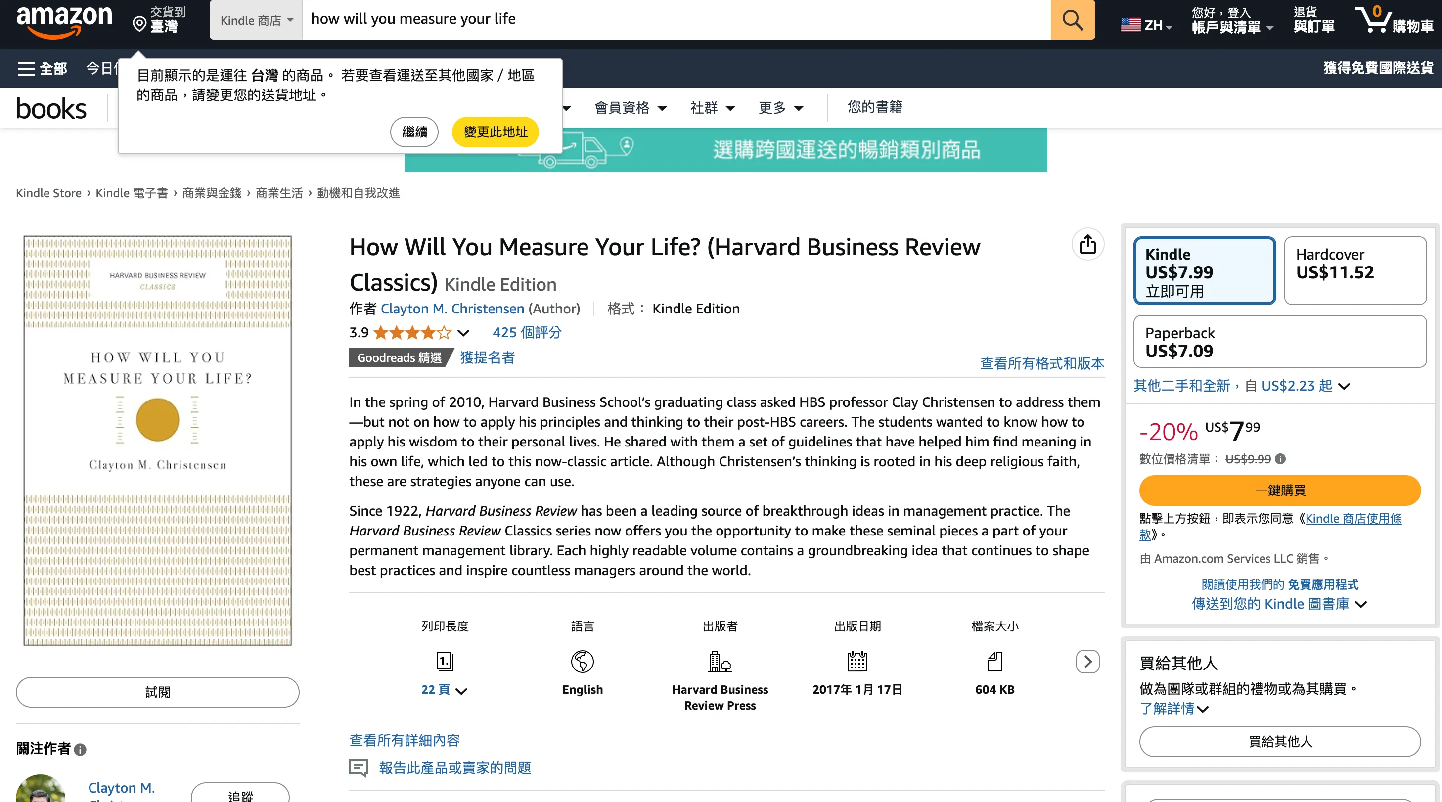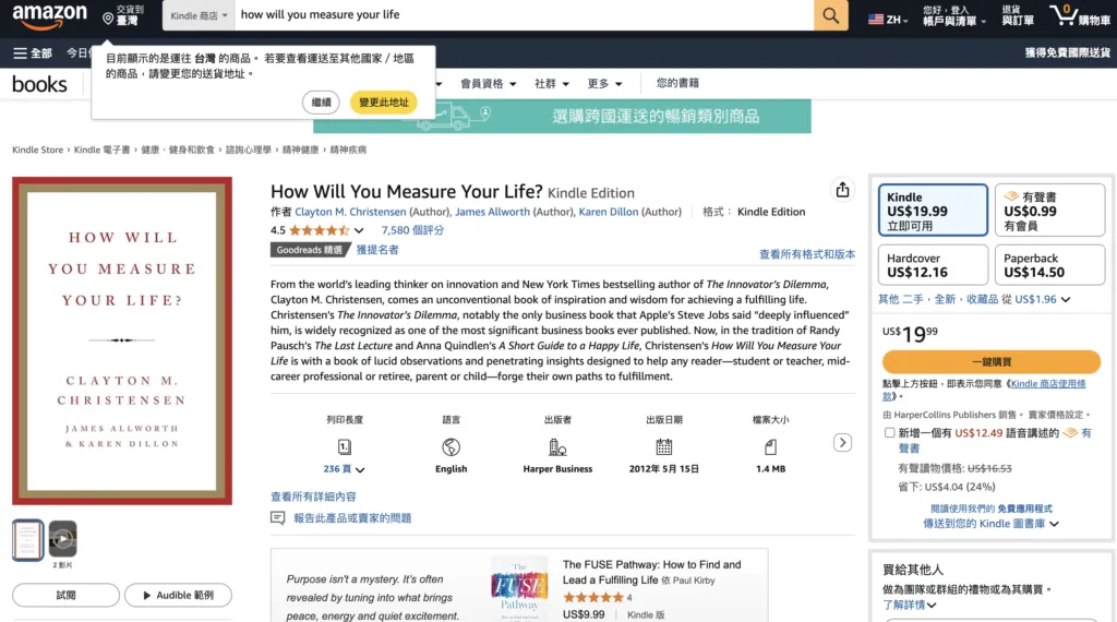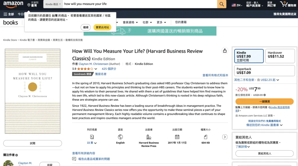 首先,我們在右方看到價差(也看到不同選項:除了 Kindle 電子書以外,還可以買有聲書或是實體書:hardcover 是精裝書而 paperback 則是平裝書,想要實體書的學習者還是可以點開來參考一下是否符合預算)。