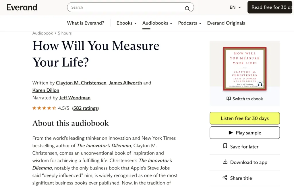 好消息是我們這次閱讀課程的選書 How Will You Measure Your Life? 不但在 Everand 的圖書館有電子書版本,還有有聲書呢!