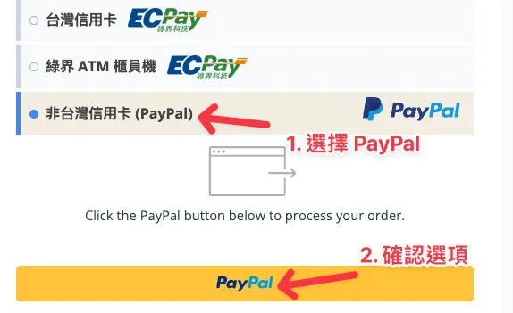 1. 付款時請選擇 「非台灣信用卡 (PayPal)」並點選下方黃色按鍵
